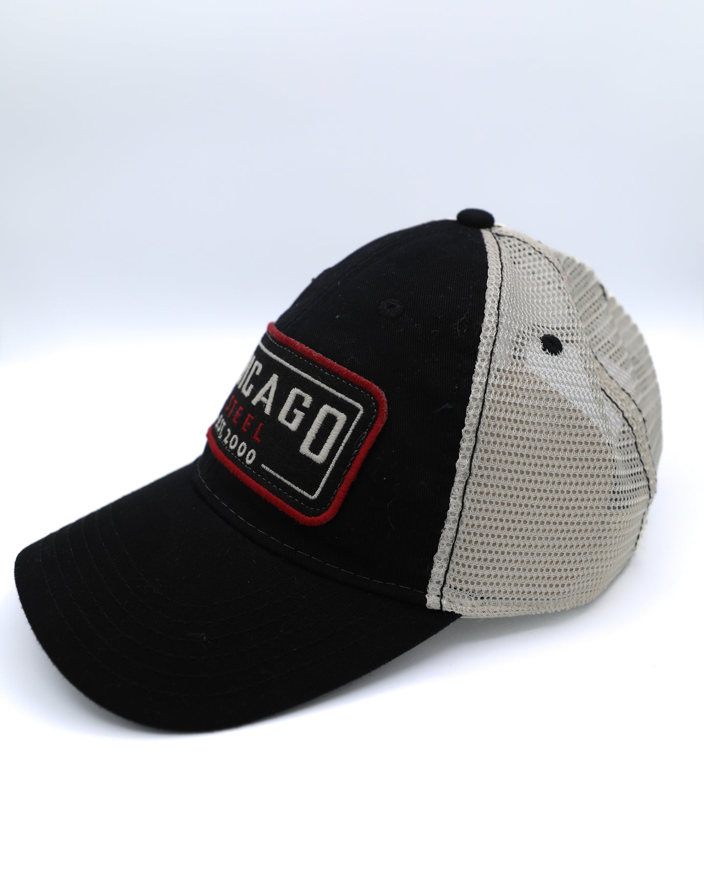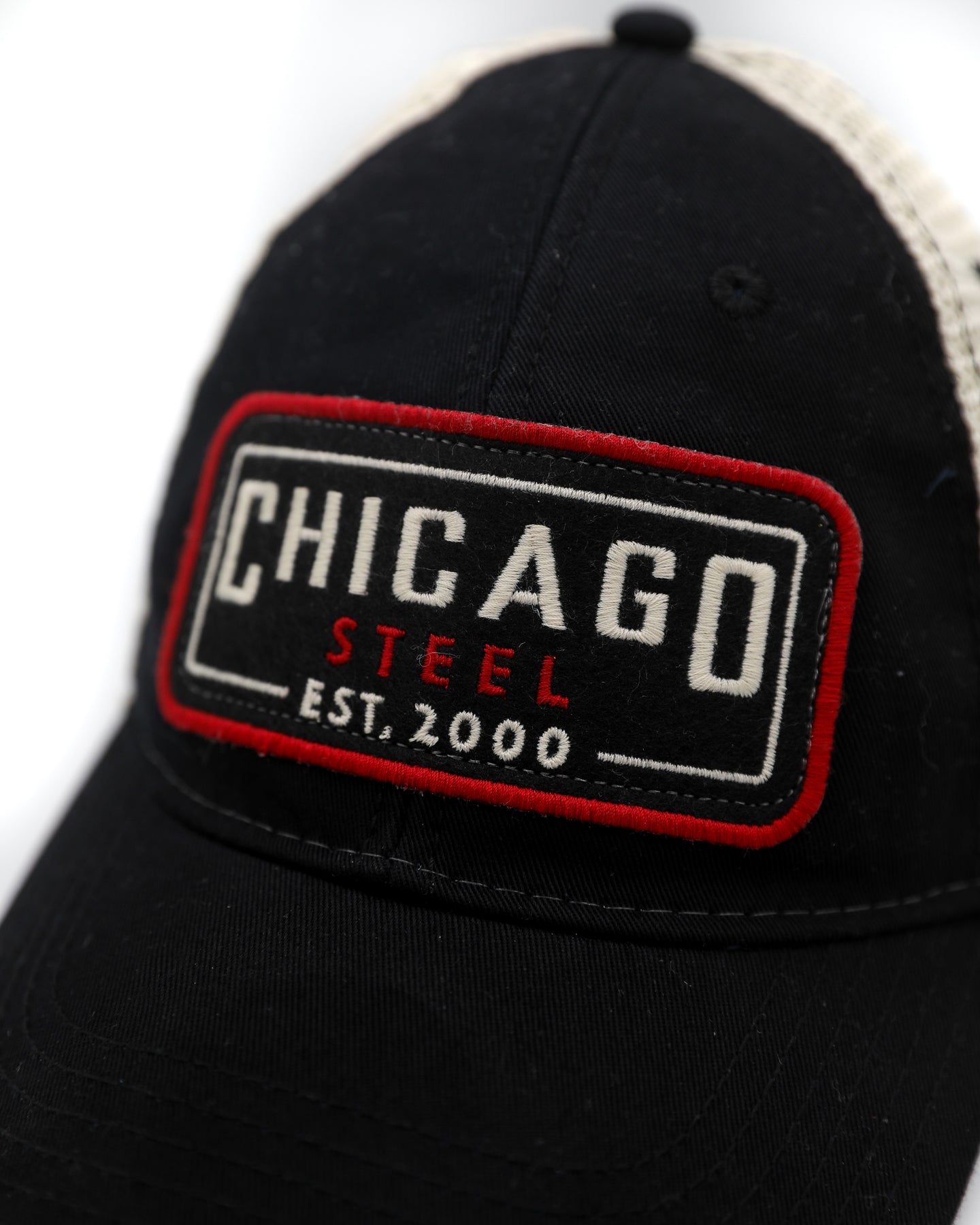 This Chicago Steel Legacy Relaxed Trucker Cap features a mid-profile structured crown, slightly curved visor and an open back snap closure.