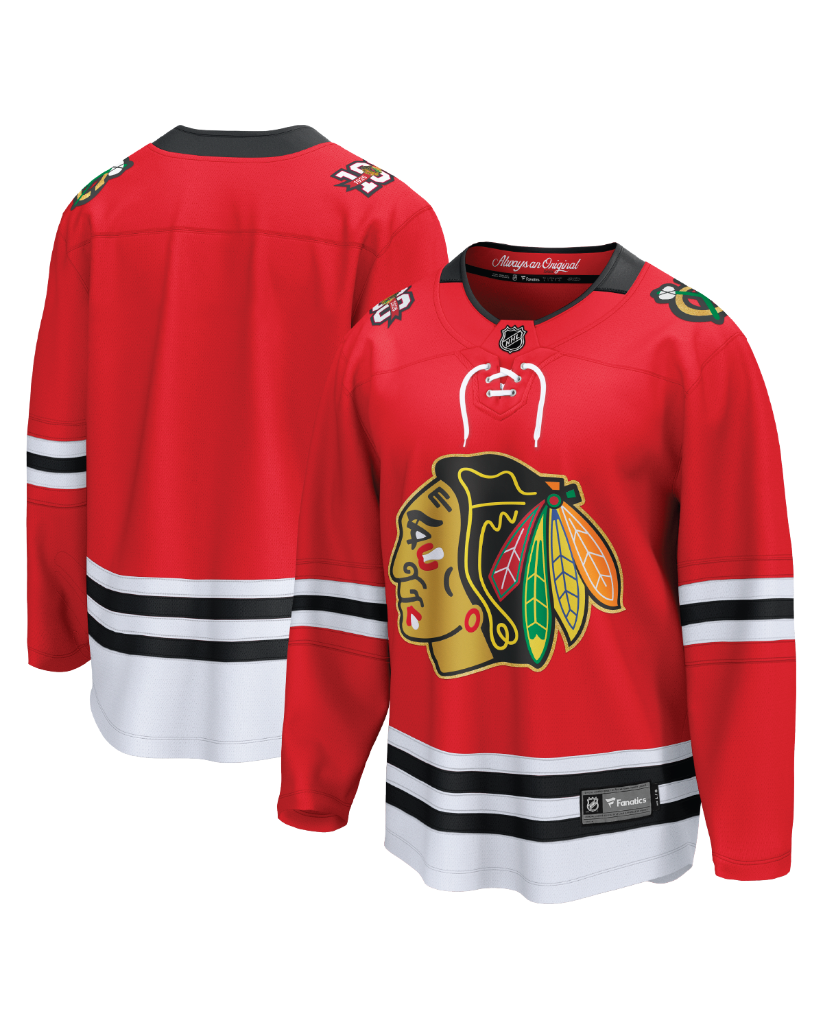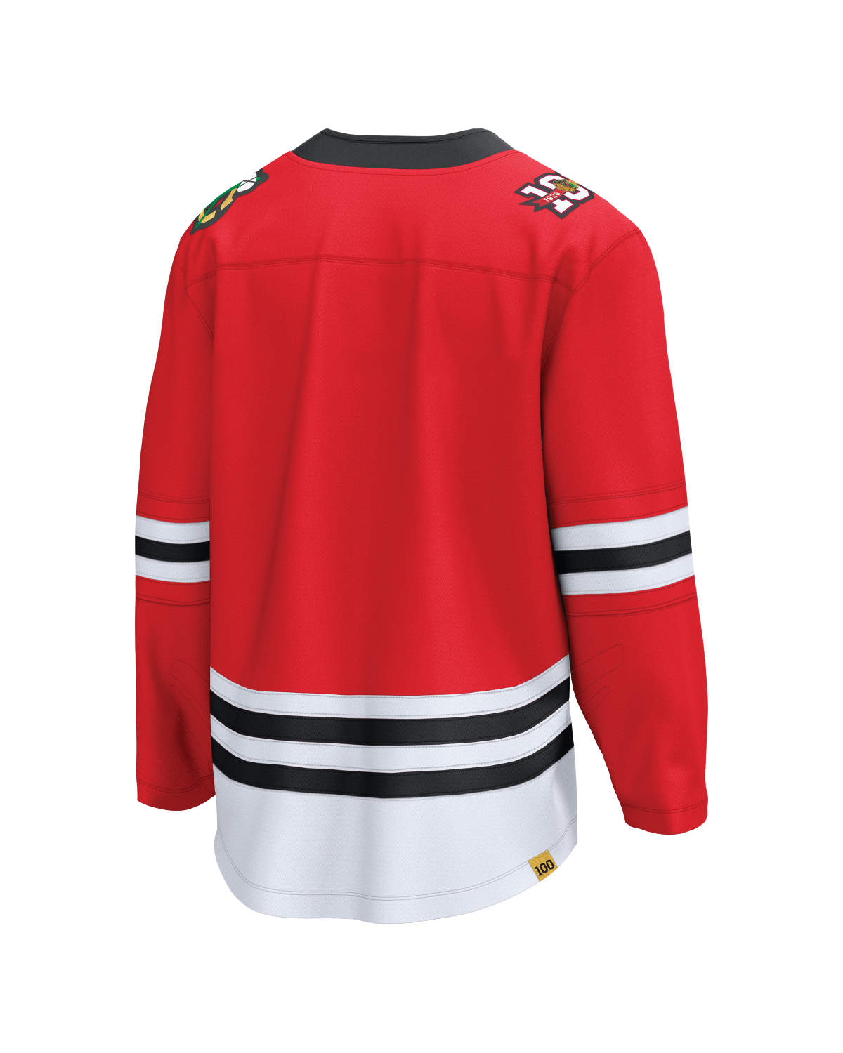 Our 2025-26 commemorative Centennial jersey honors this legendary design while celebrating 100 years of Blackhawks history. Premium details include premium gold accents, a vintage lace-up collar, exclusive Centennial shoulder patch, and all six Stanley Cup championship years embroidered inside the hemline—details only Day One fans will know are there.