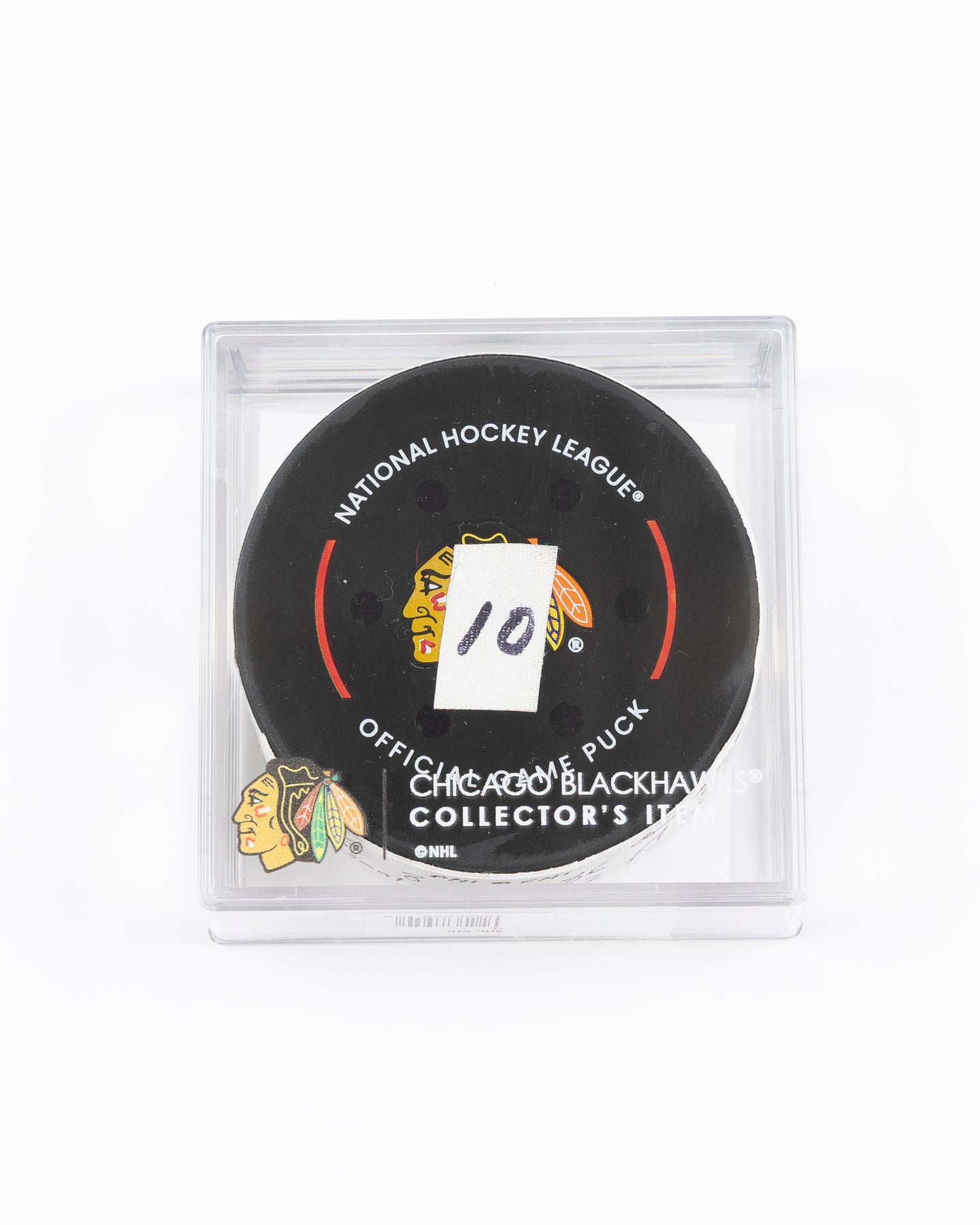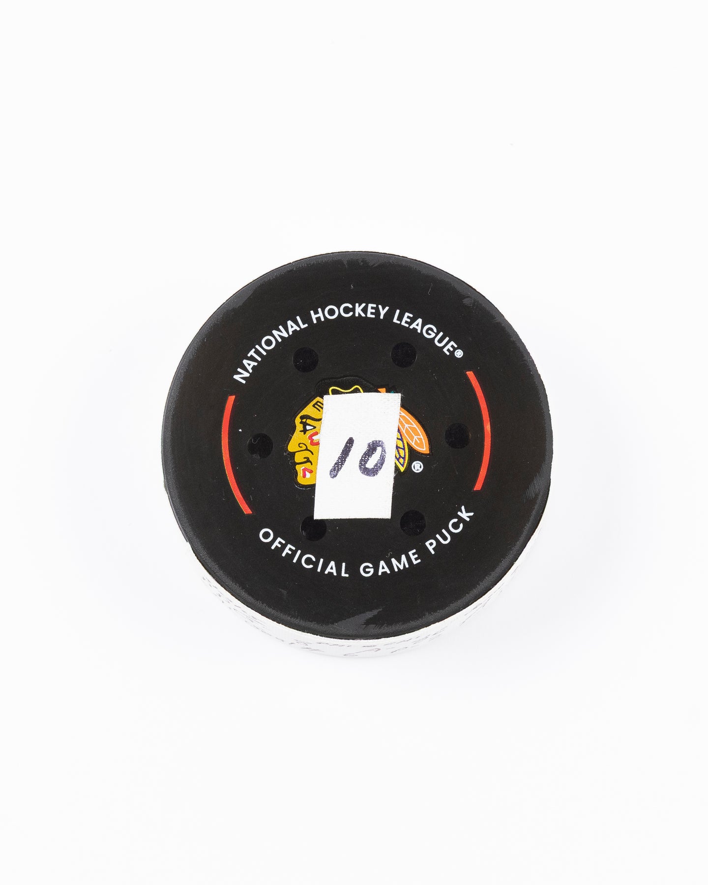 official hockey goal puck scored by Chicago Blackhawks player Ryan Donato on 3/23/25 - front angle lay flat