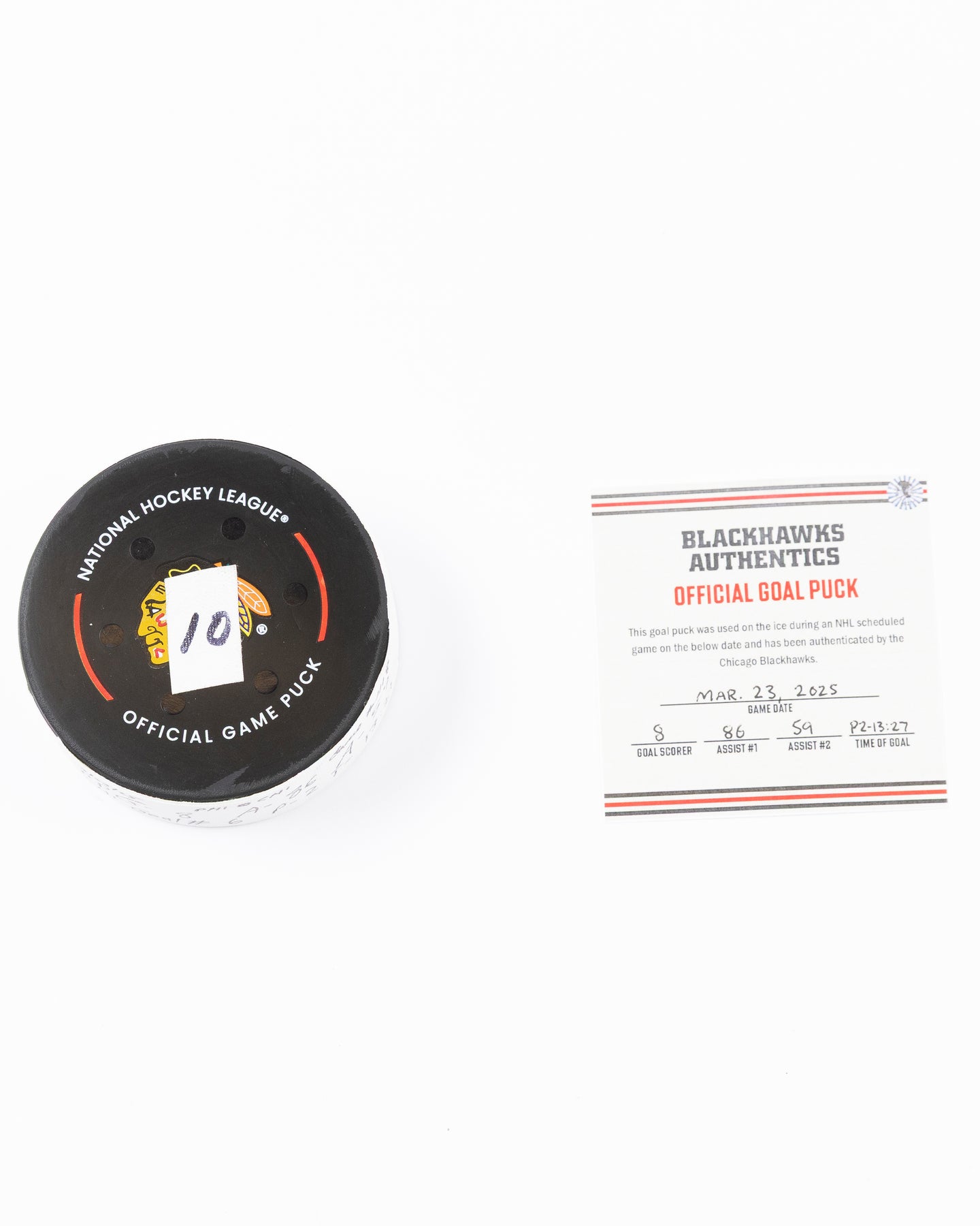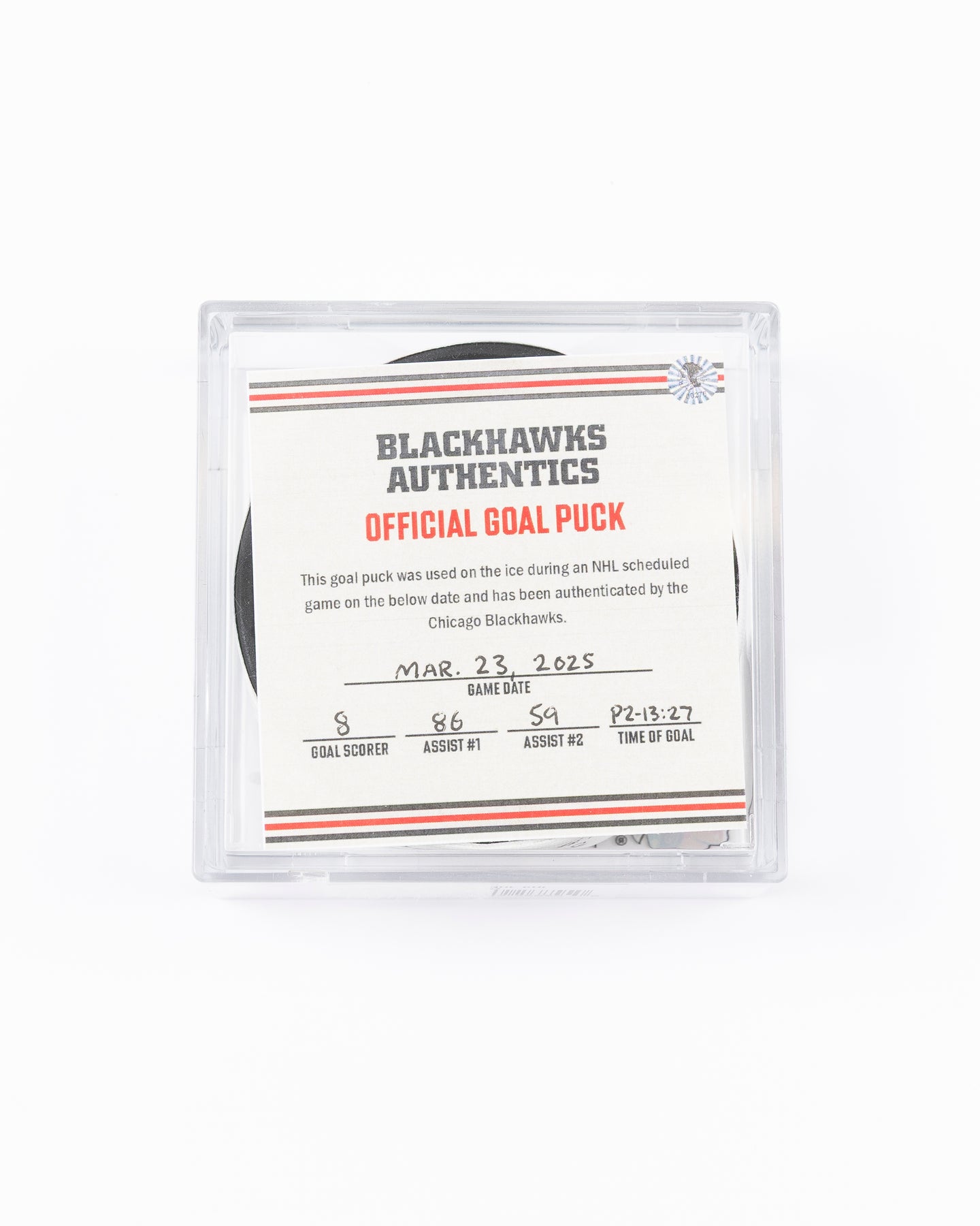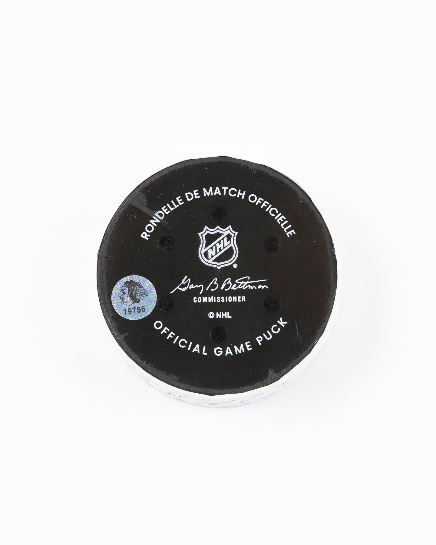 official hockey goal puck scored by Chicago Blackhawks player Ryan Donato on 3/23/25 - back angle lay flat