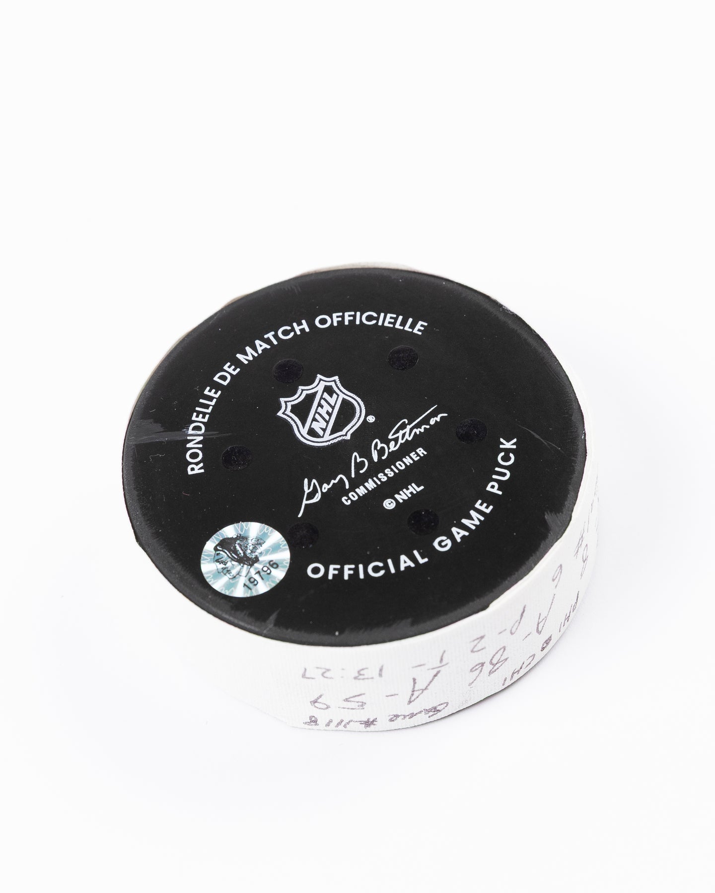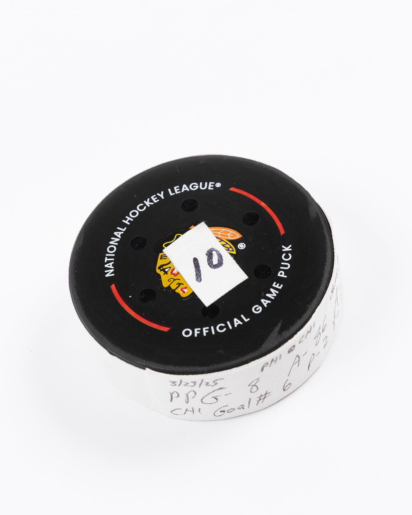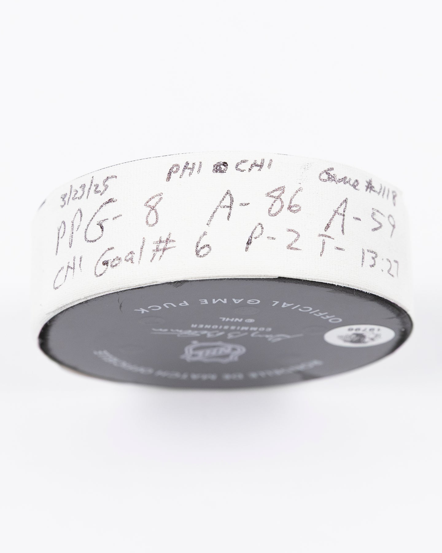 official hockey goal puck scored by Chicago Blackhawks player Ryan Donato on 3/23/25 - back angle lay flat
