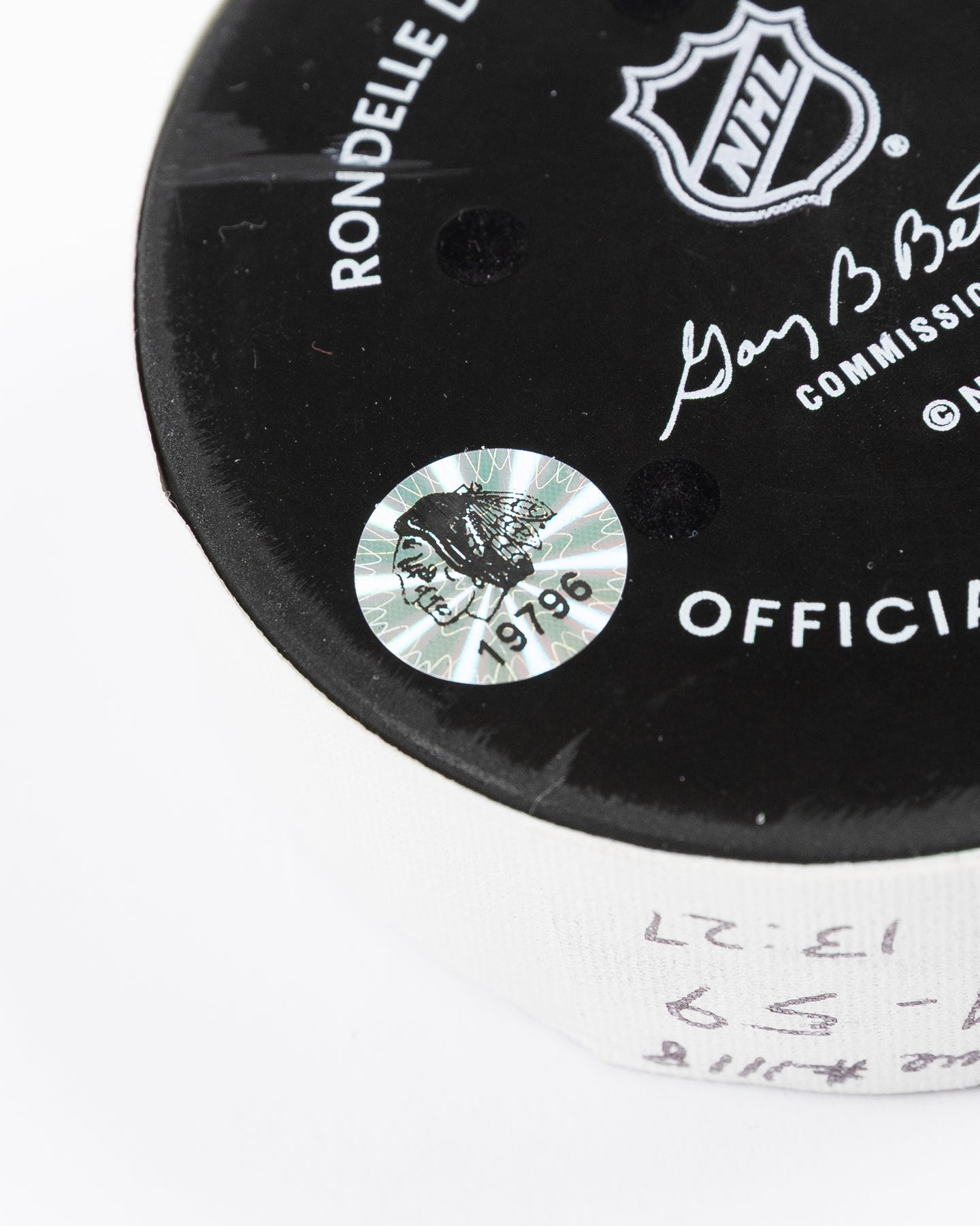 official hockey goal puck scored by Chicago Blackhawks player Ryan Donato on 3/23/25 - back lay flat