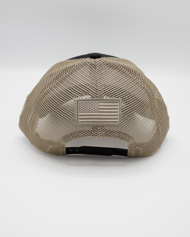 black and khaki Colosseum trucker hat with IceHogs military patch on front and OHT and Colosseum patches on sides - patch detail lay flat