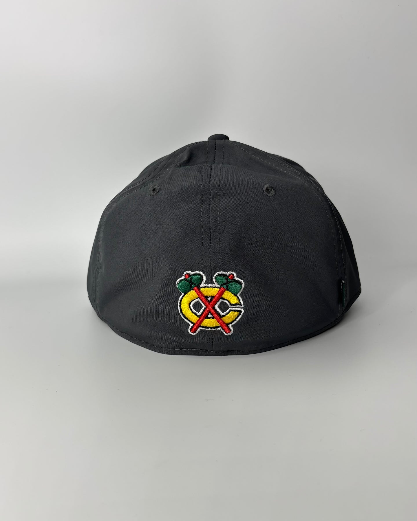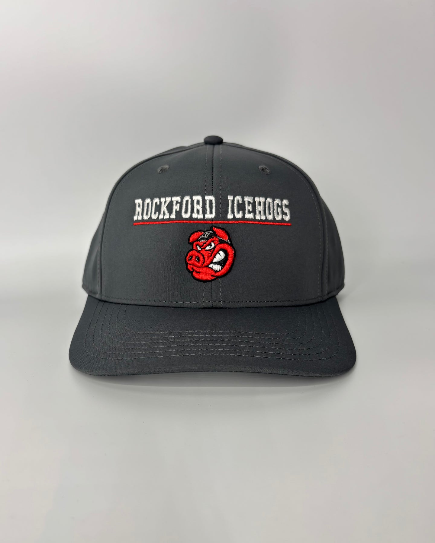 This Rockford IceHogs Legacy Back 9 Stretch Fit Hat features a raised Hammy logo on the front of a dark grey hat with a logo on the back.