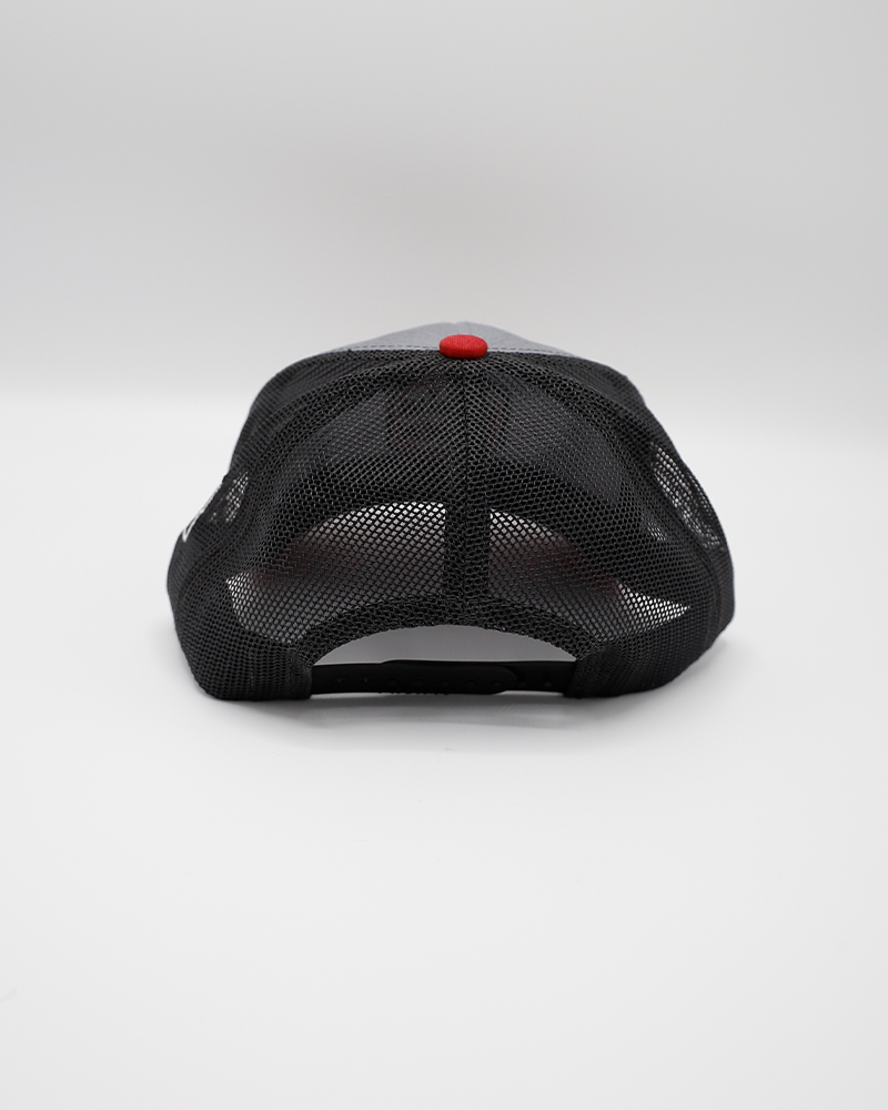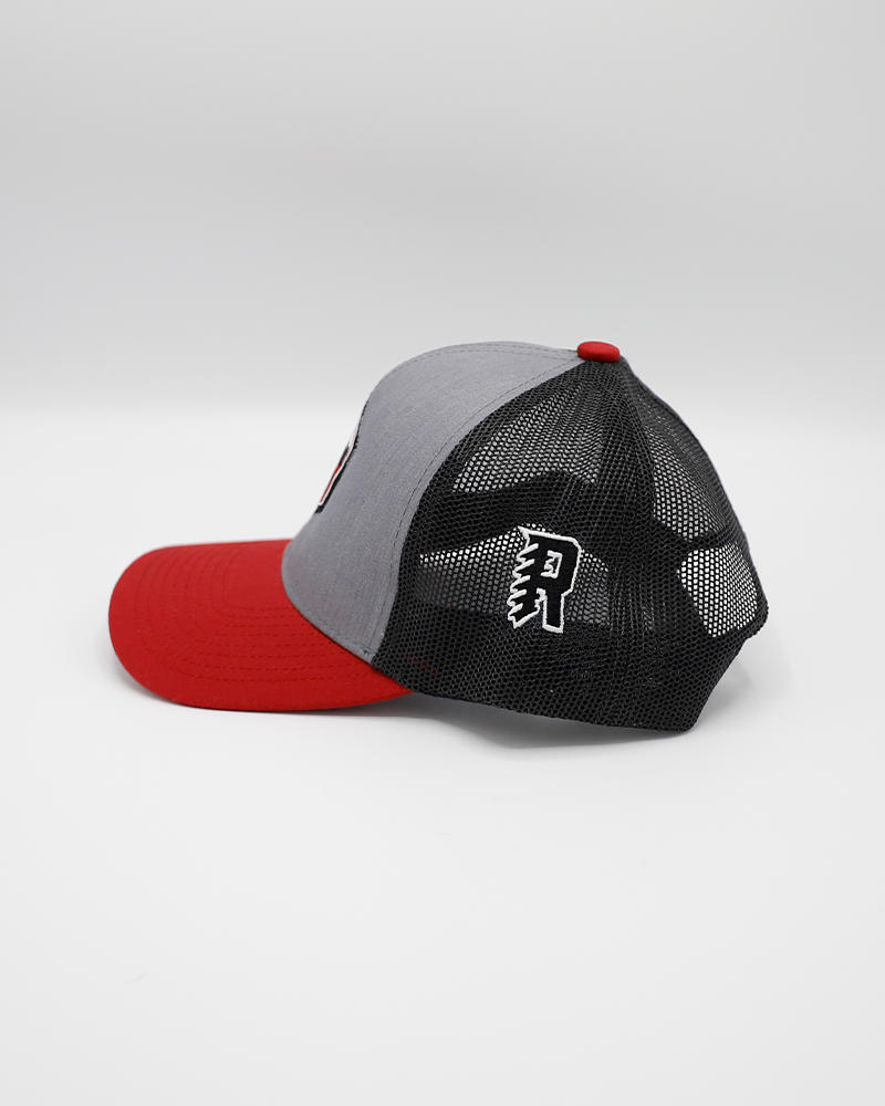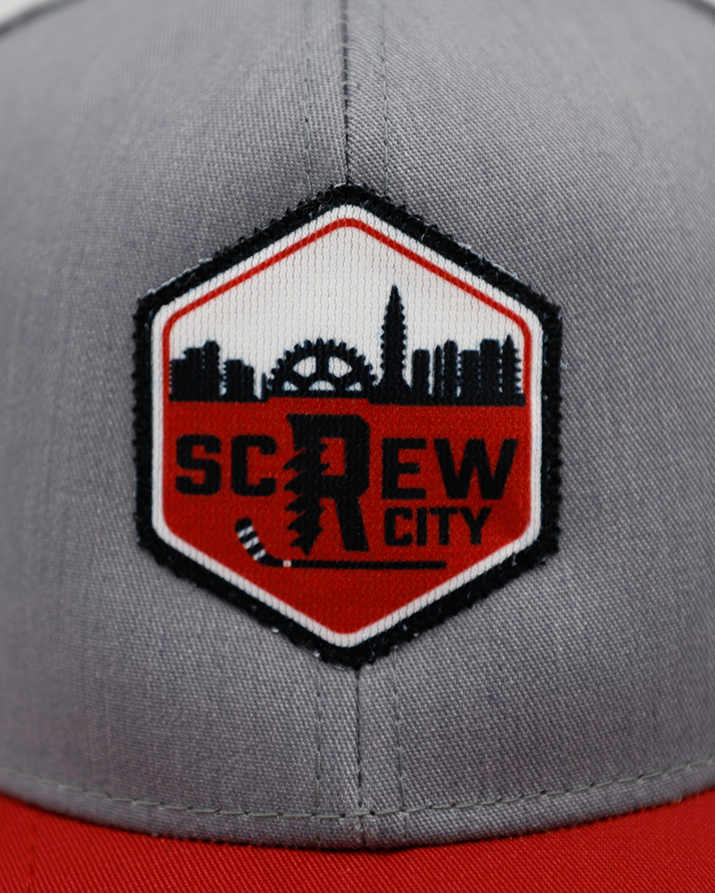 This Rockford IceHogs Screw City with R Patch Adjustable Hat features an embroidered Screw City hexagon patch on the front and an R logo on the left ide on a black, grey and red trucker cap.