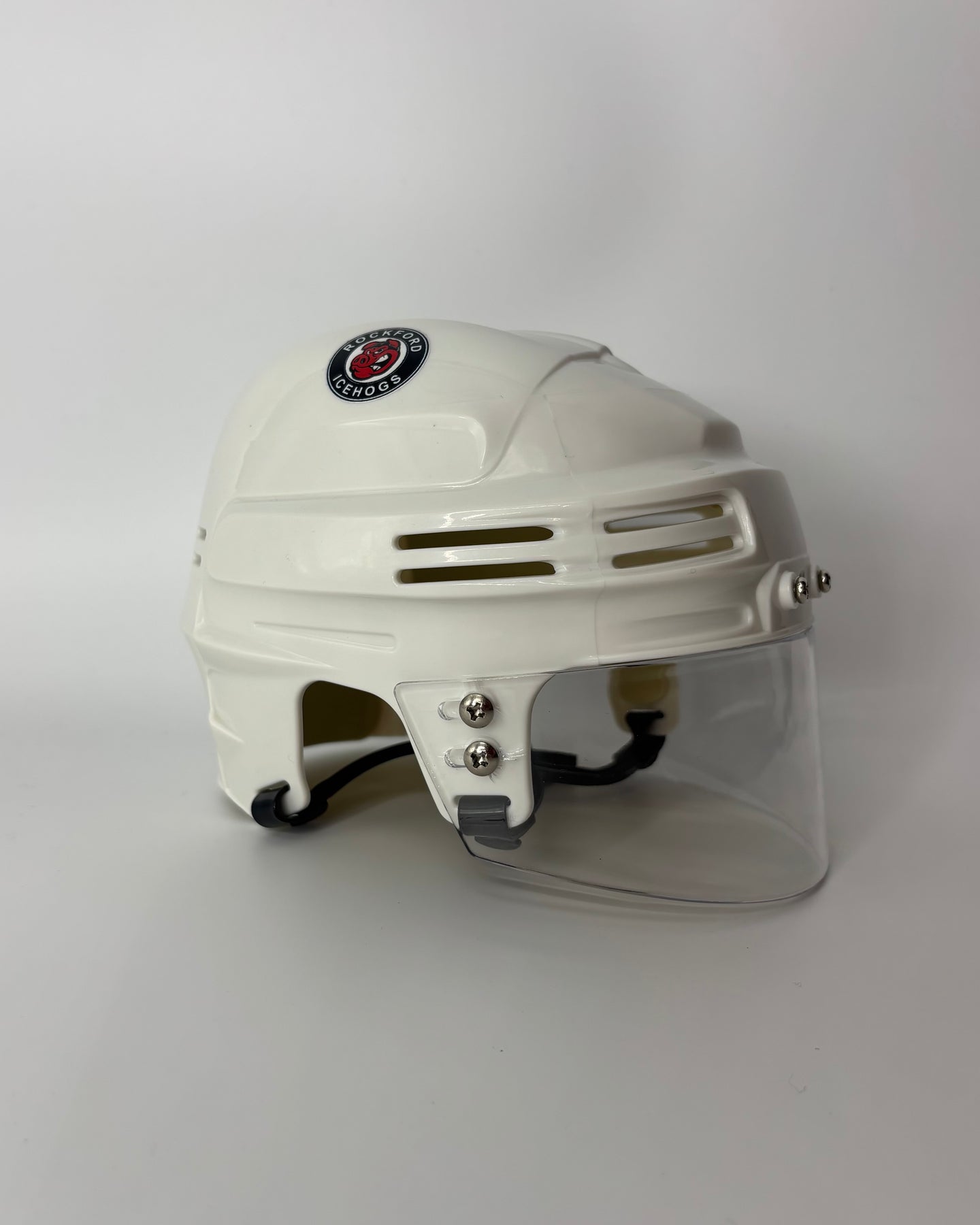 This Rockford IceHogs Mini Helmet features a medallion logo on both sides of a white replica helmet.