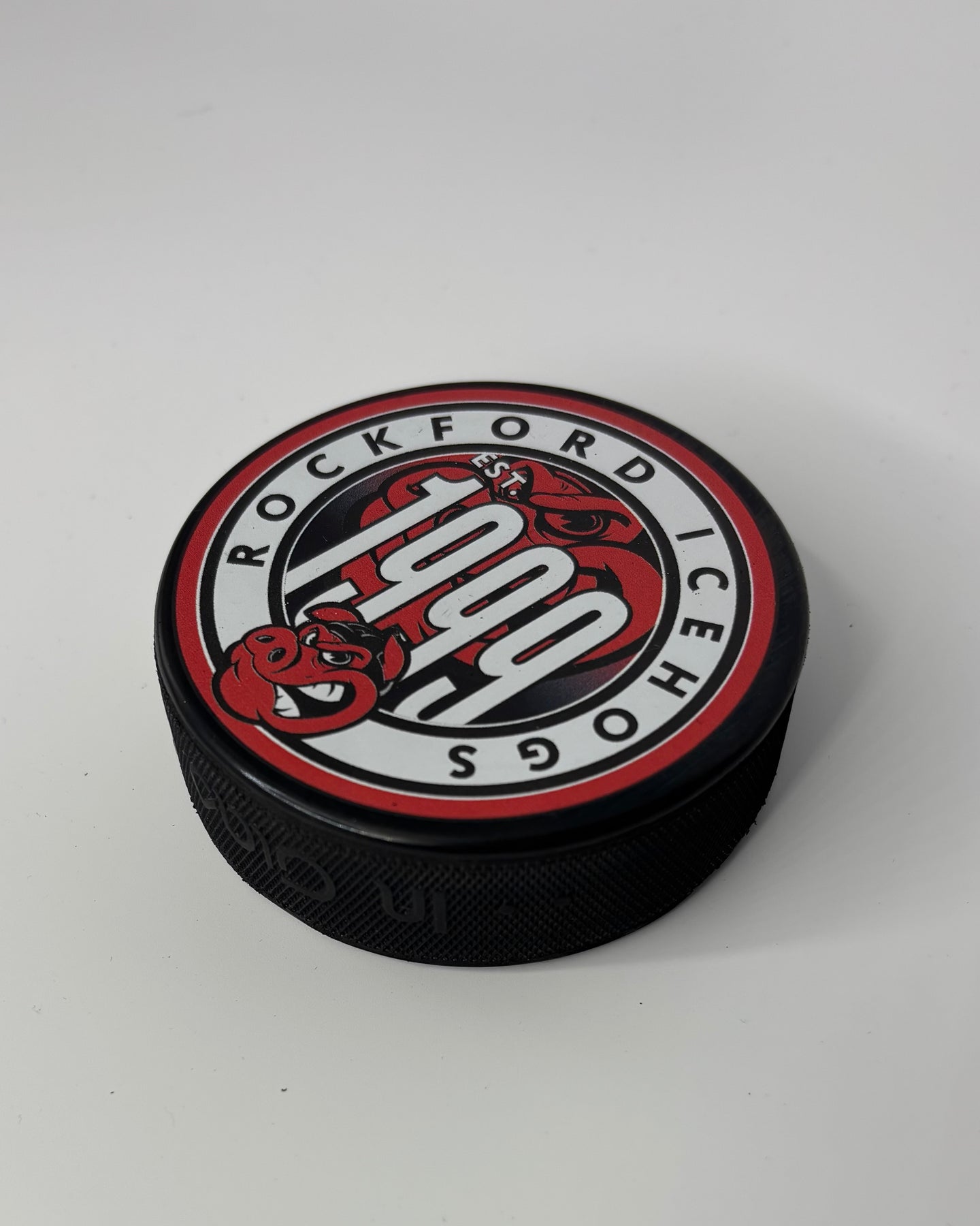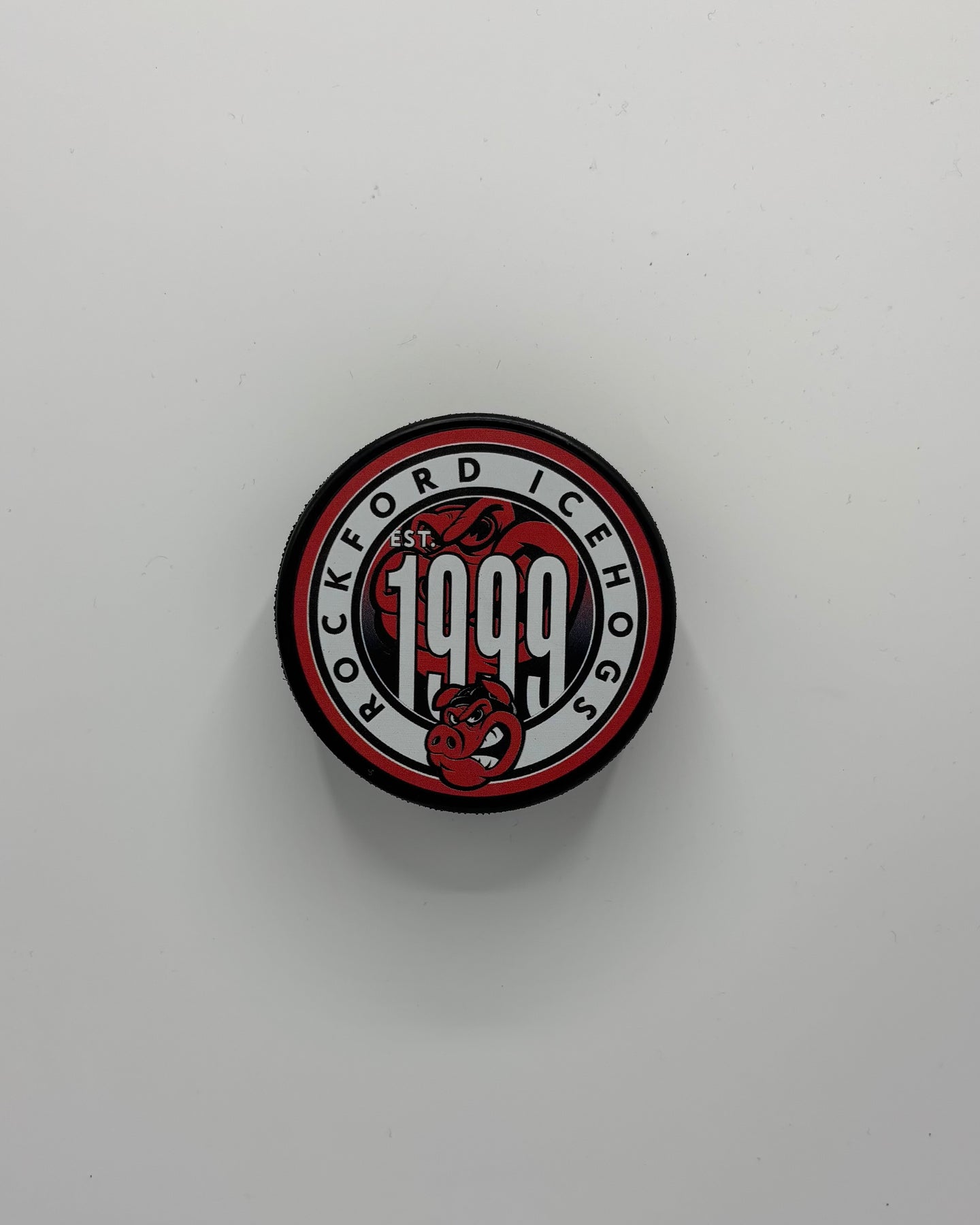This Rockford IceHogs Bold Date Hockey Puck features a combination of our logo and the year 1999 with the official AHL logo on the back.
