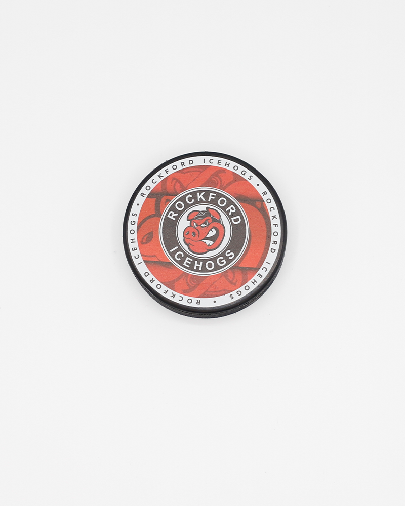 This Rockford IceHogs Red Hockey Puck features a close up of your favorite mascot Hammy on an all over black puck.