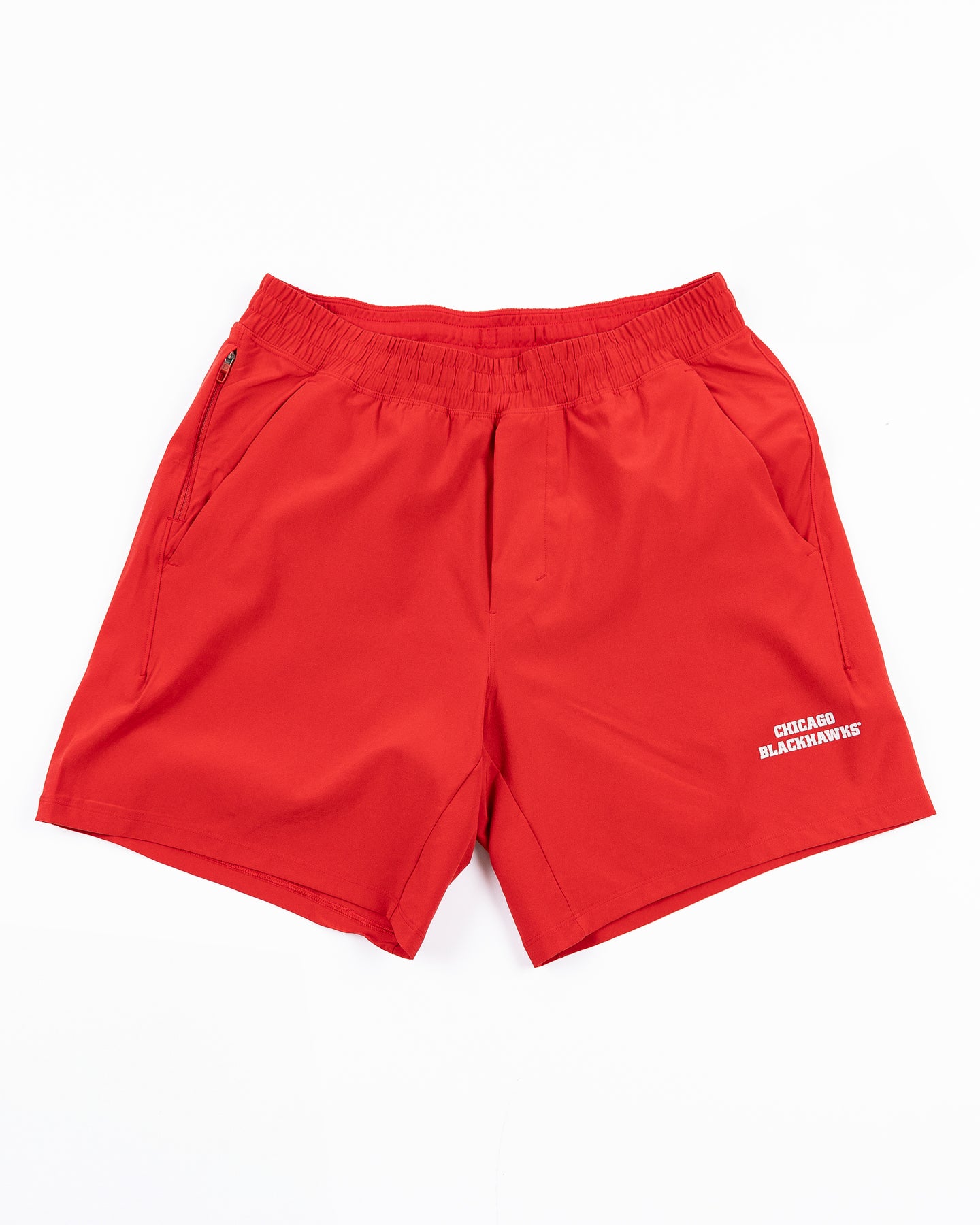 red lululemon men's shorts with Chicago Blackhawks wordmark printed on left leg - front lay flat