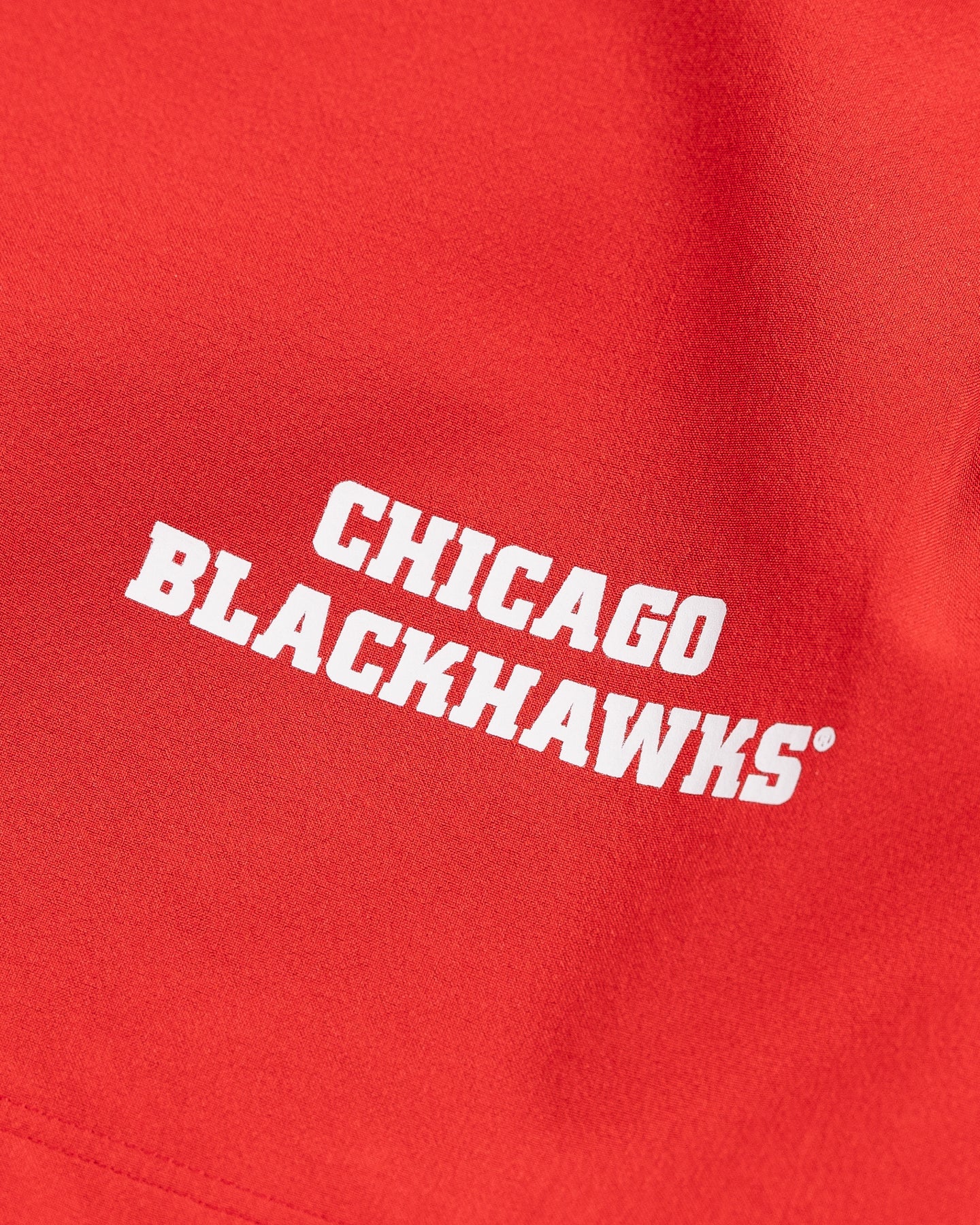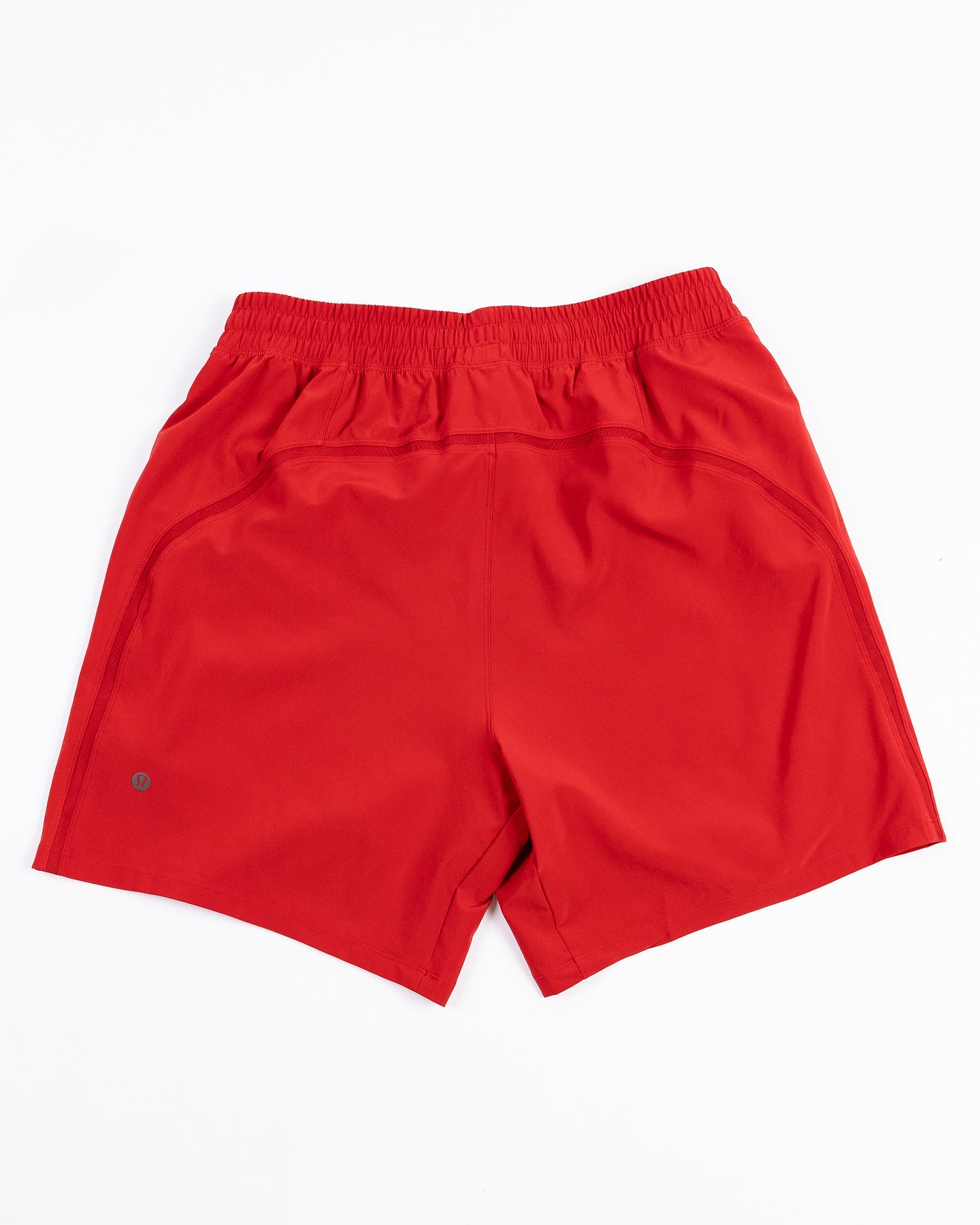 red lululemon men's shorts with Chicago Blackhawks wordmark printed on left leg - back lay flat