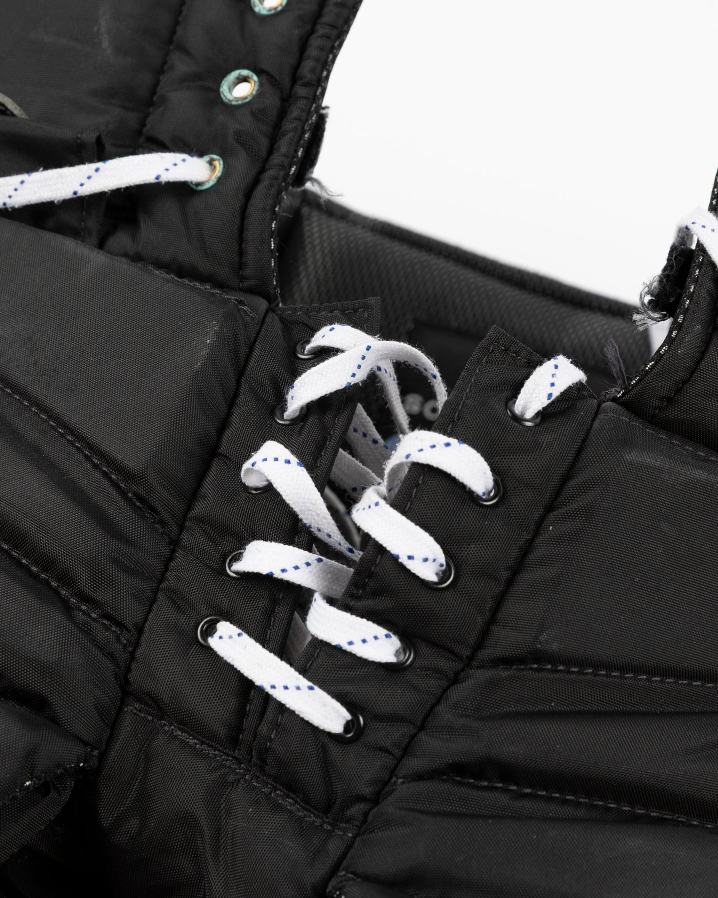 black Vaugh hockey pants used by Chicago Blackhawks goalie Arvid Soderblom - lace detail lay flat
