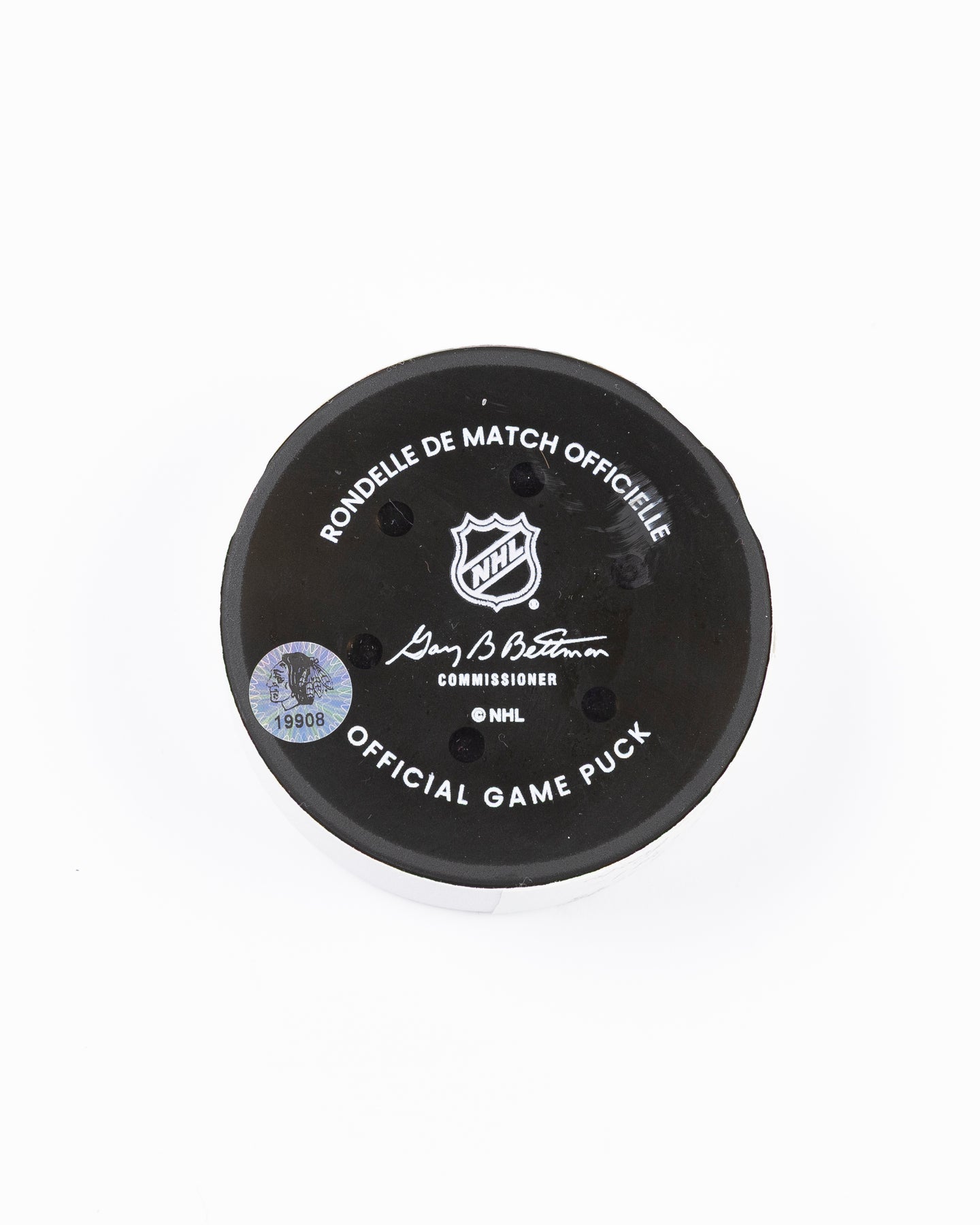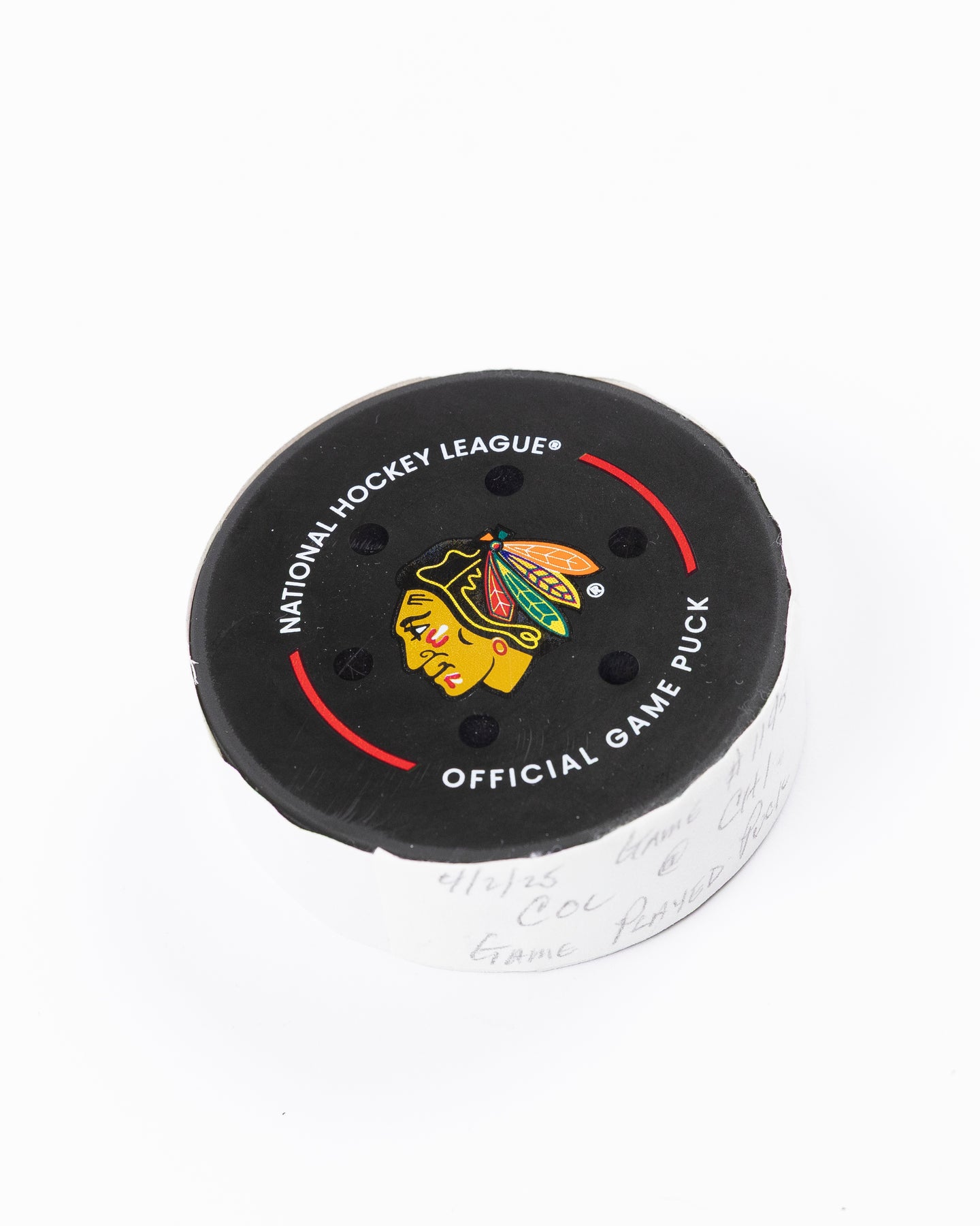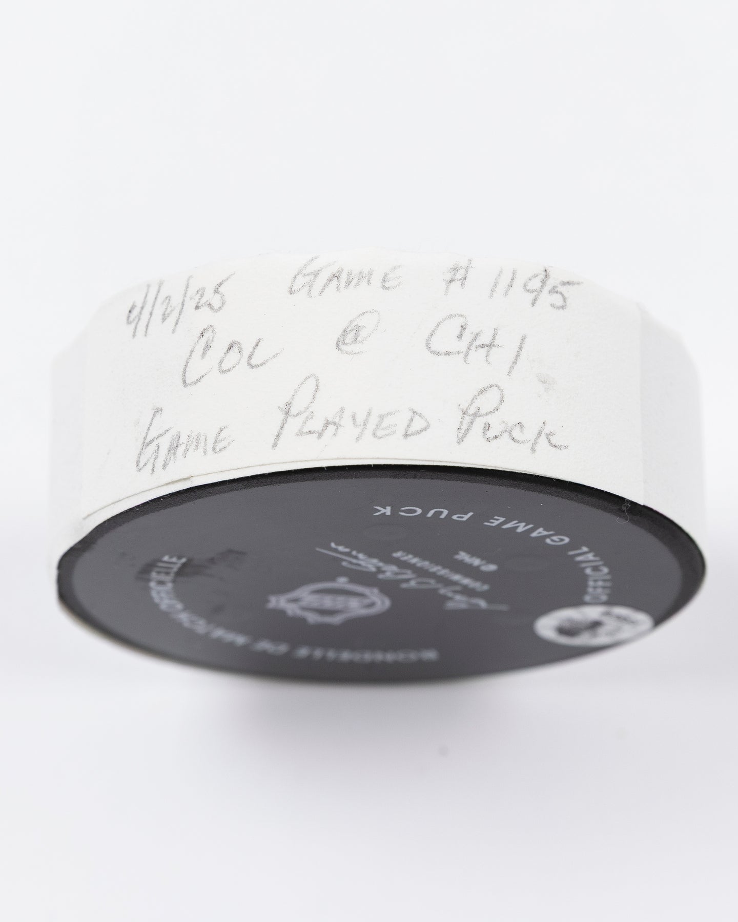 This official game puck was used in the game against the Colorado Avalanche on April 2, 2025. Final score (SO): Blackhawks 2, Avalanche 3. Authenticated with hologram sticker 19908. This item is not autographed.