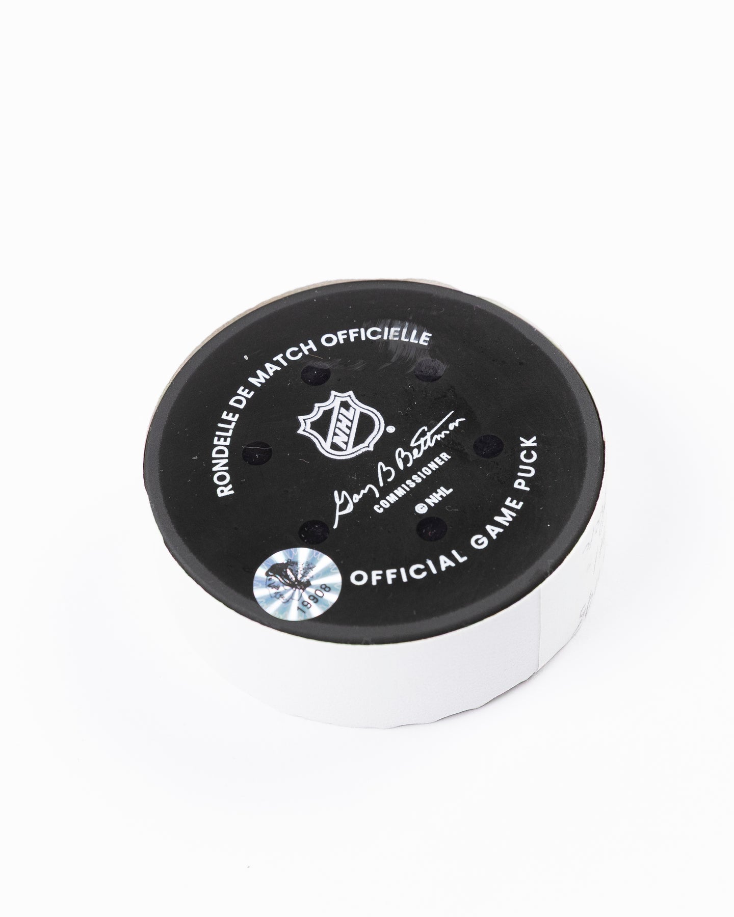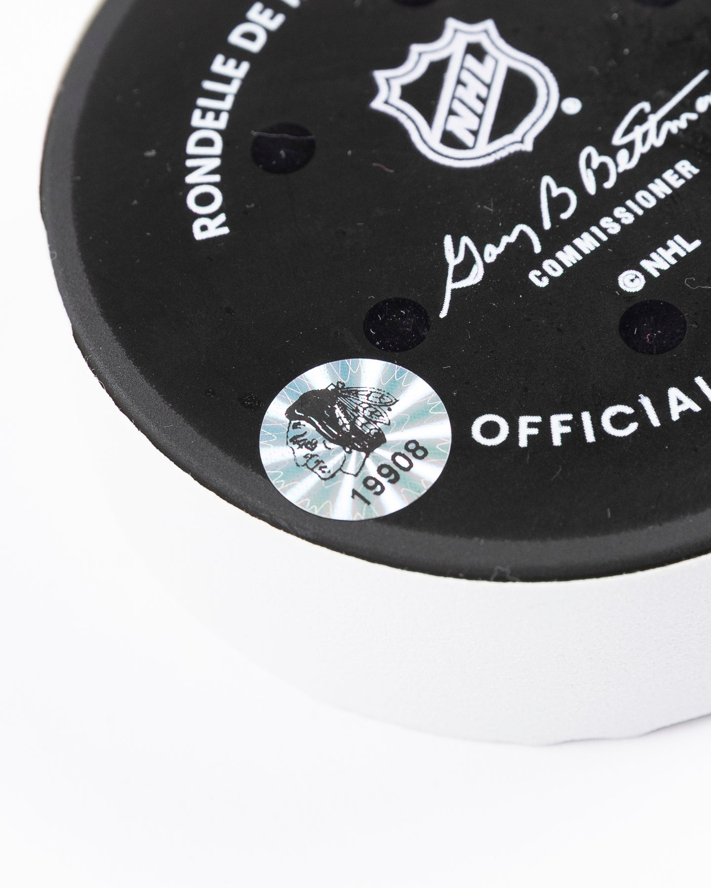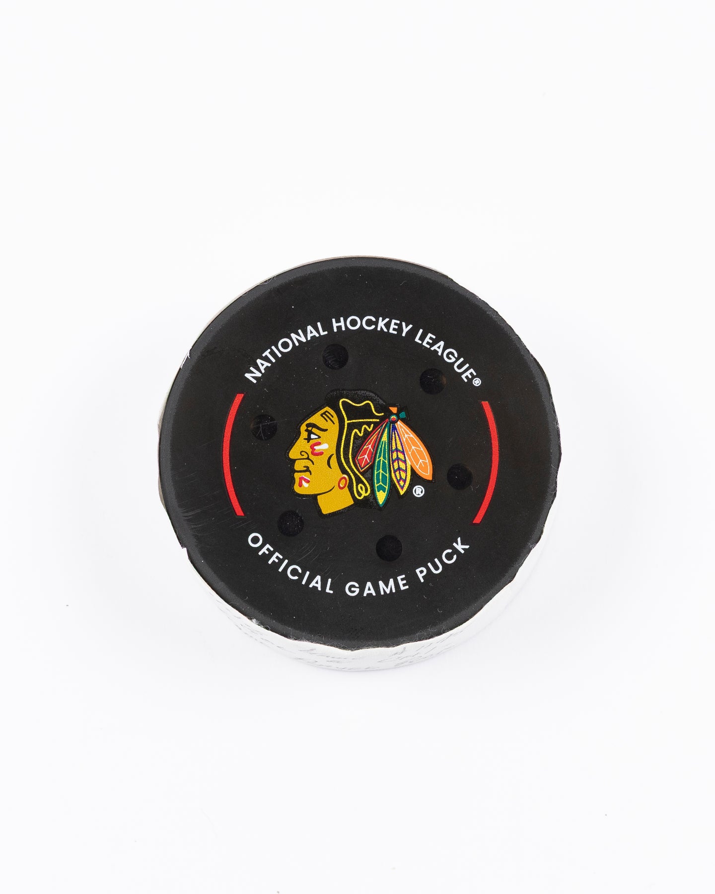 This official game puck was used in the game against the Colorado Avalanche on April 2, 2025. Final score (SO): Blackhawks 2, Avalanche 3. Authenticated with hologram sticker 19908. This item is not autographed.