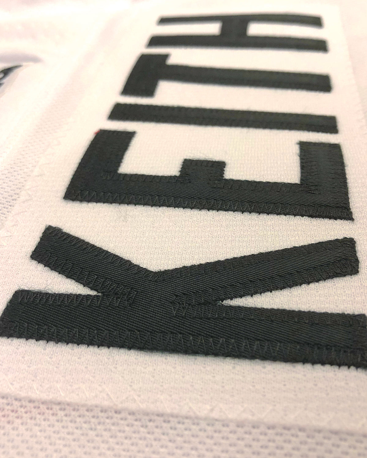 Once your jersey arrives at the lettering company, each letter and number is custom-cut from tackle-twill fabric. The letters of the name are applied to a nameplate with adhesive and then each letter is individually stitched to the nameplate. The nameplate is custom cut to the length of the name and then sewn down to the upper back of the jersey. The numbers are a dual-layer tackle twill that are also applied with adhesive and then sewn down directly to the jersey back and sleeves.