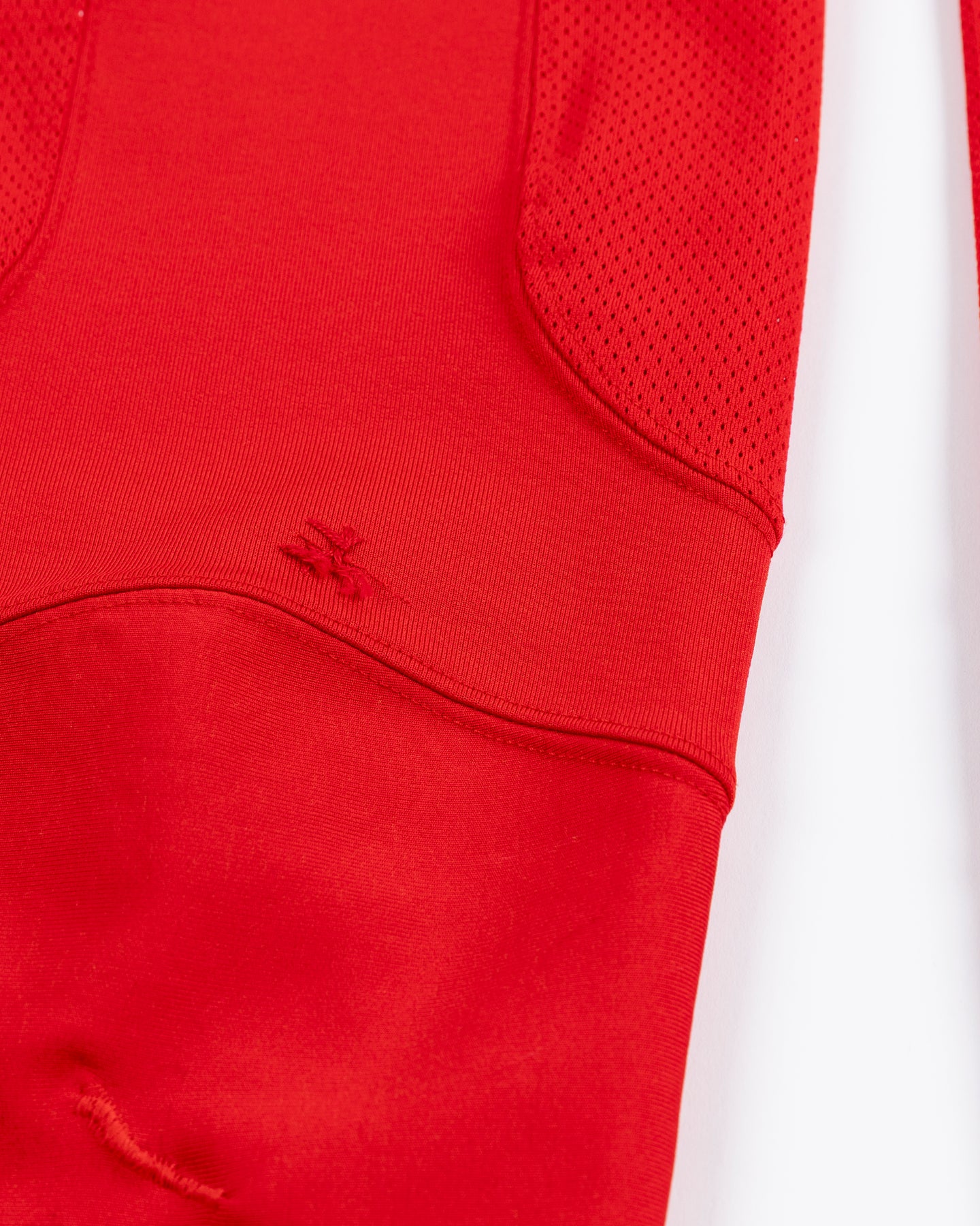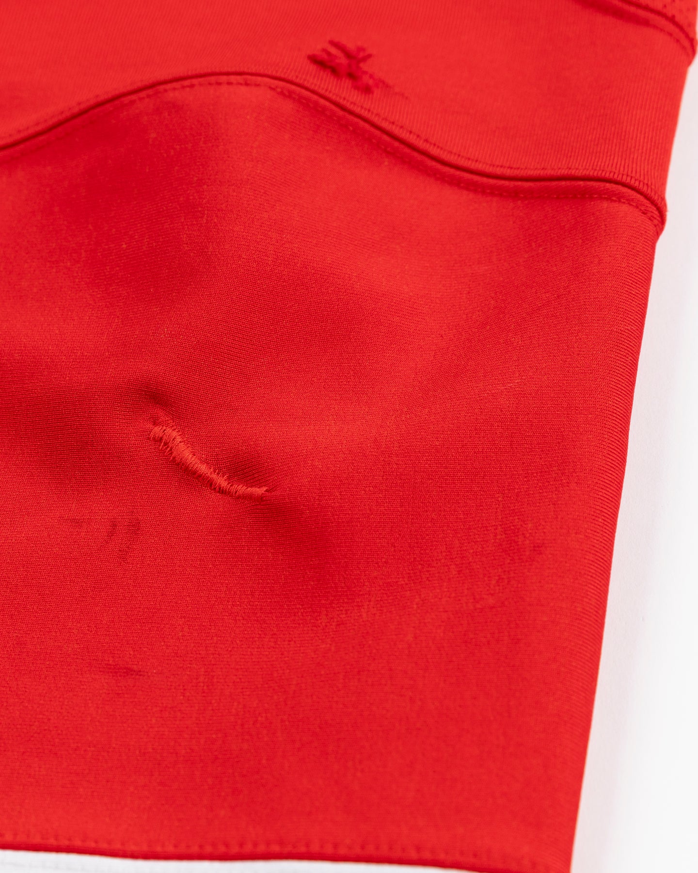 red adidas hockey socks used by Chicago Blackhawks player Nick Foligno - stitch detail lay flat