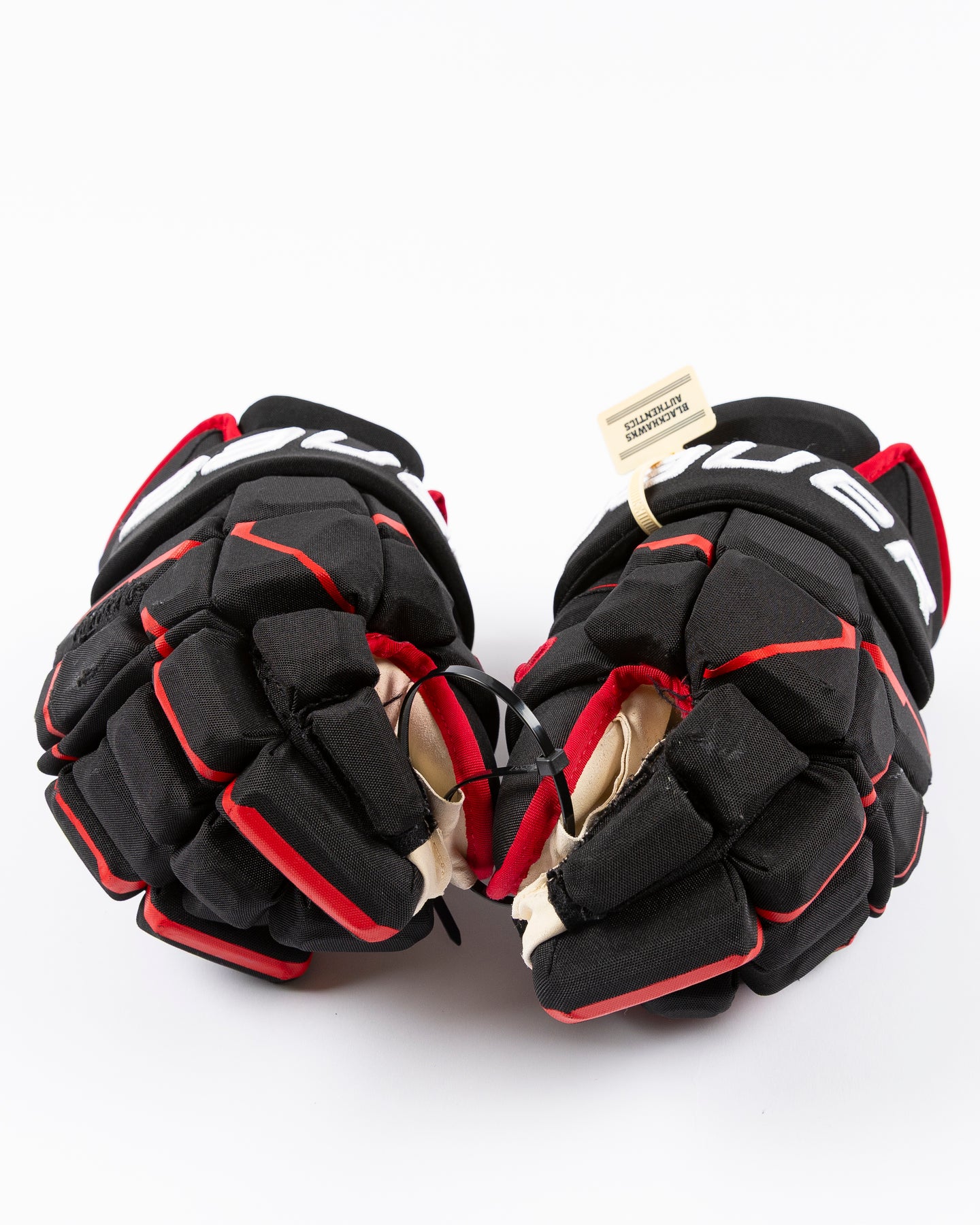 These Bauer gloves were worn by Pat Maroon and have been authenticated with hologram sticker 19861. This item is not autographed.