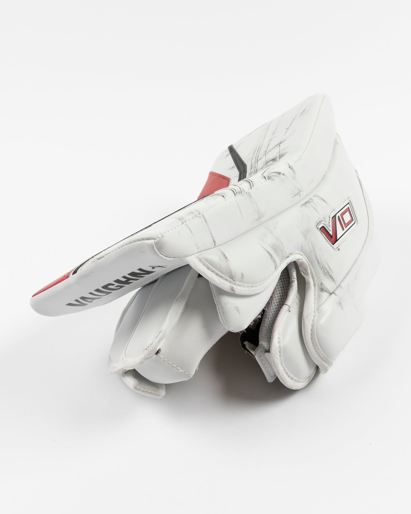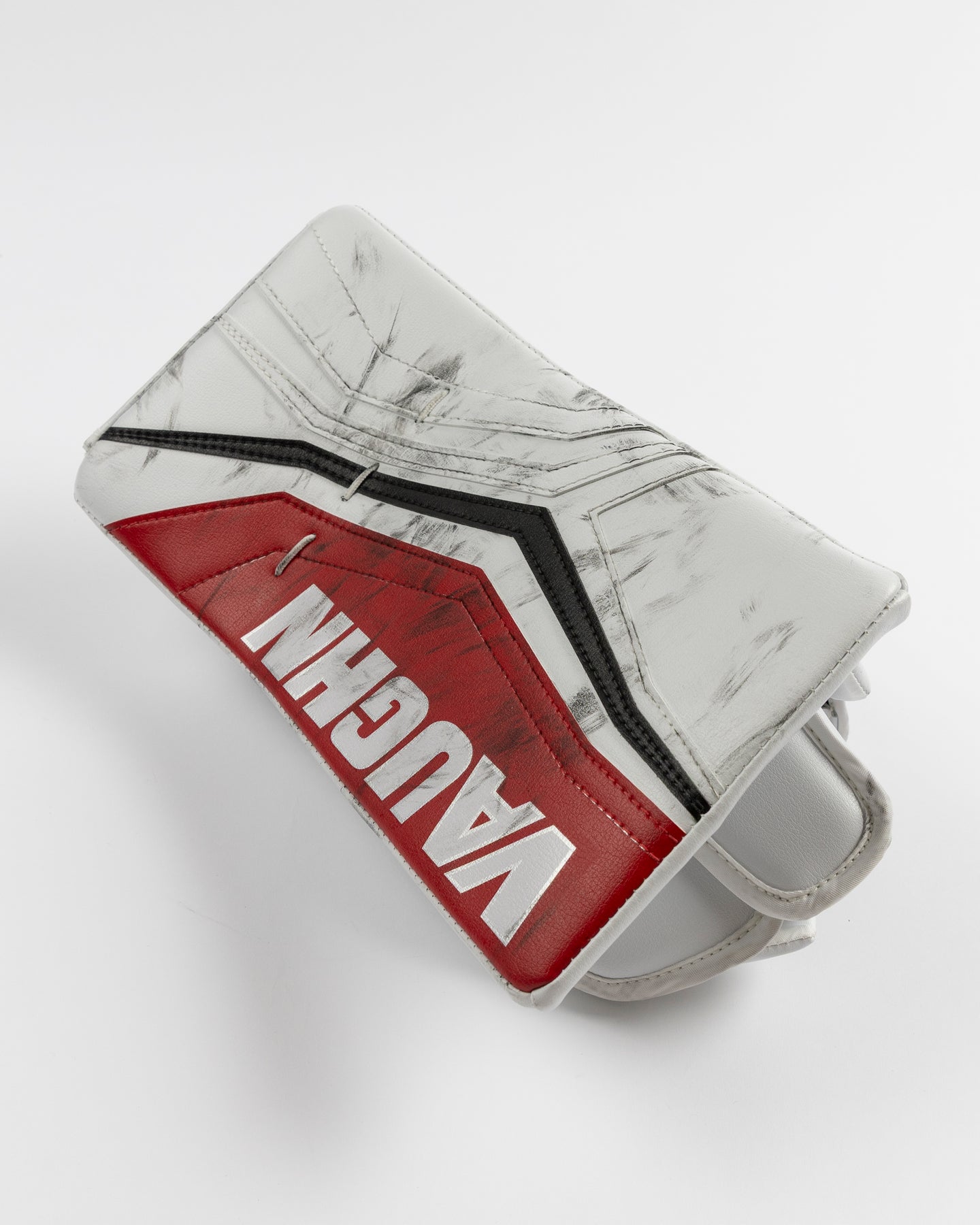 This Vaughn goalie blocker was worn by Petr Mrazek and has been authenticated with hologram sticker 19936. This item is not autographed.