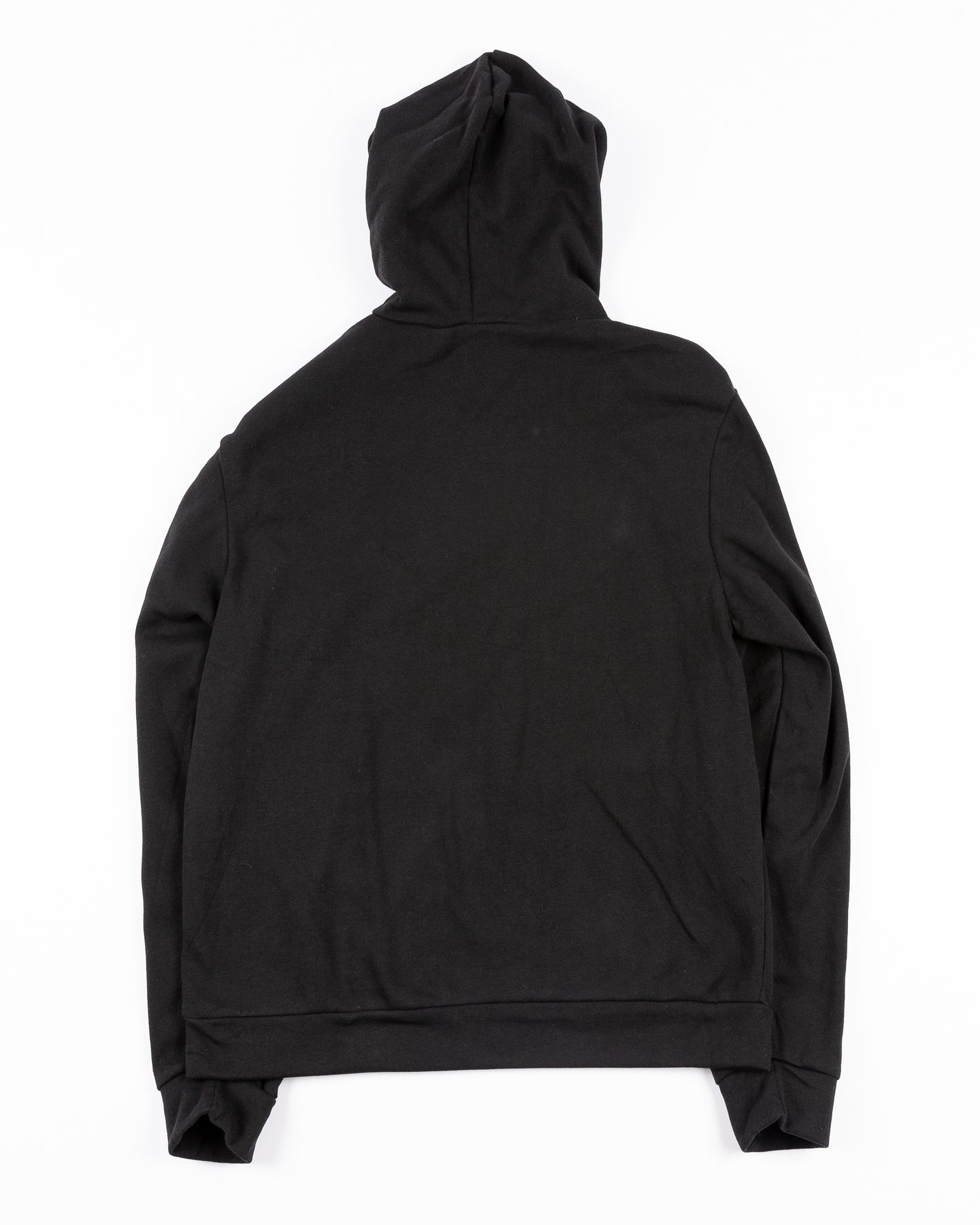 black Rockford IceHogs hoodie with primary logo on red kangaroo pouch and IceHogs wordmark on left sleeve and all over primary logo print on inside of hood - left sleeve detail lay flat