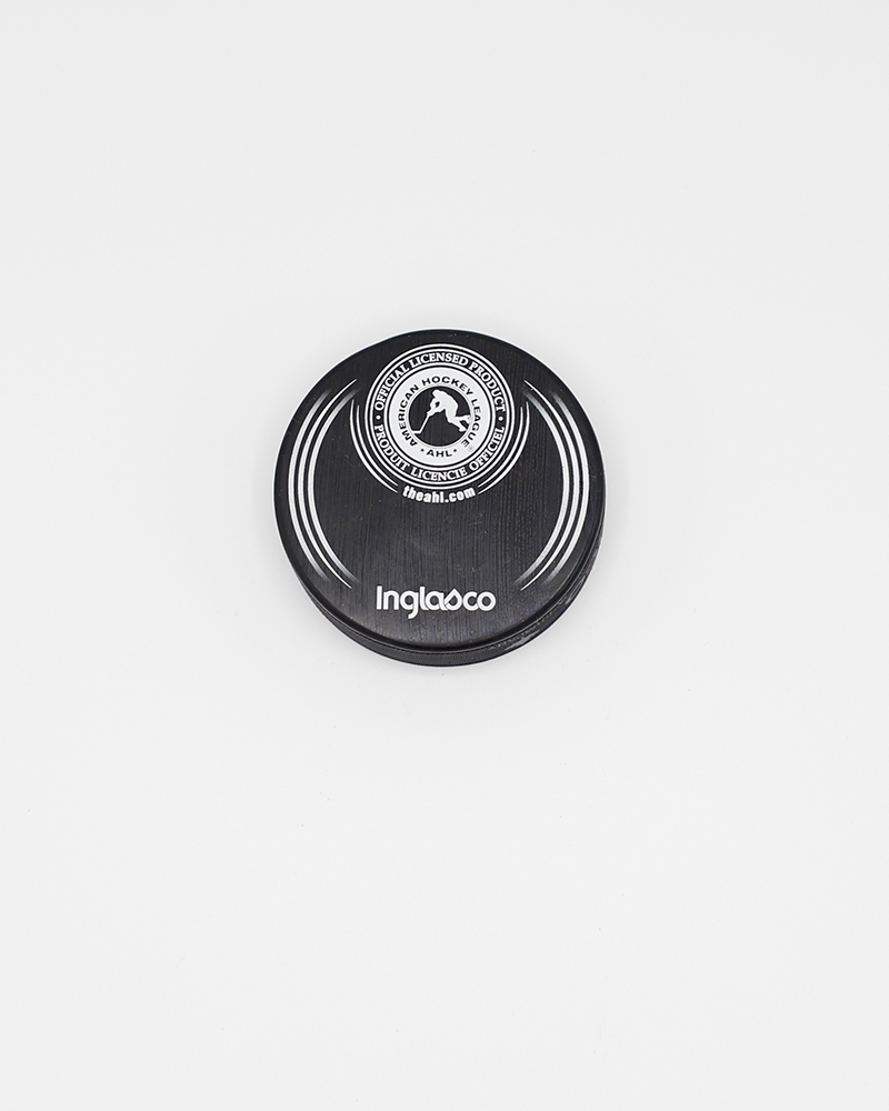 black hockey puck with Happy Birthday Hammy wordmark and photo of Rockford IceHogs mascot Hammy on front - back lay flat